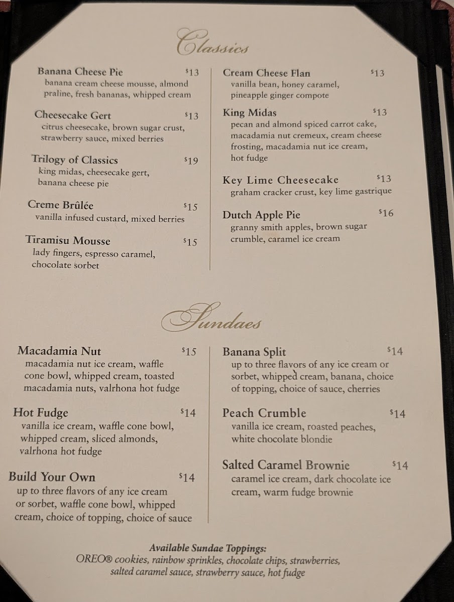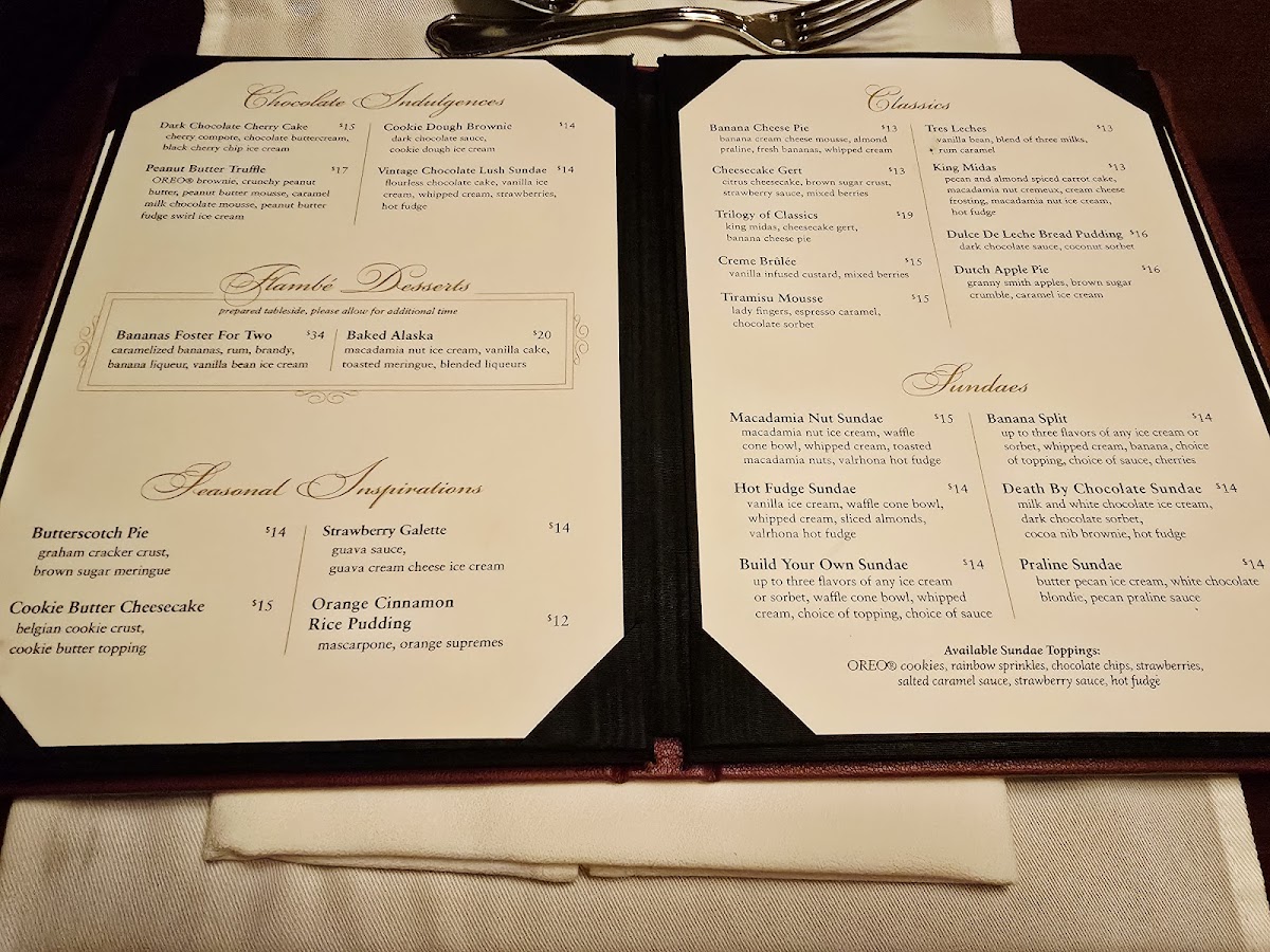 From the welcoming first sip of a handcrafted cocktail to the last bite of a carefully plated dessert, each item is designed to be enjoyed in the warm, timeless atmosphere of the restaurant. Highlights like the Prime Filet Mignon served with crisp onion rings and green beans, or the rich French Onion Soup Au Gratin, provide familiar comforts elevated with attention to detail. Whether visiting for a leisurely dinner or indulging in the dessert room upstairs, featuring treats like Baked Alaska and the Macadamia Nut Sundae, the menu suits moments meant for savoring good food and company.